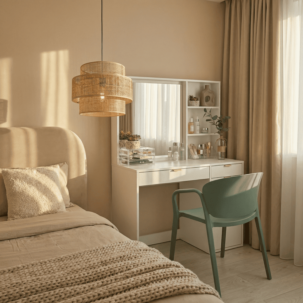 Maderas naturales, fibras como el lino o el algodón, cerámicas artesanales y textiles suaves aportan textura, calidez y autenticidad. Se combinan con paletas en tonos tierra como, beige, arena, verdes o arcillas que evocan paisajes naturales y ayudan a crear ambientes serenos. Aquí, cada material tiene un propósito: transmitir calma y equilibrio.
